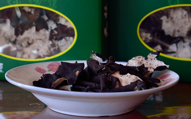 屬地衣門石耳科,菌體葉狀,正面為灰白或灰綠色,反面為黑褐色,多生長于海拔700-2000米懸崖峭壁的陰濕石縫間。石耳常以小群落的形式分布,少則幾片,多則百余片。一公斤干石耳約1400片左右,因而極其珍貴。石耳的藥用價值很高,《神農(nóng)本草經(jīng)》就把它列為上等藥材。其主要成份有氨基酸、卵磷質(zhì)和多種微金屬元素。有滋陰潤肺、治療高血壓和各種熱癥等攻效,對抑制腫瘤、出血也有積極作用。同時石耳亦可佐菜食用?!笆鸁跫佐~”、“石耳烏雞湯”等乃為上等佳肴。天柱山地處江淮之間,氣候溫和、雨量充沛,終年云霧繚繞,且境內(nèi)群山環(huán)繞,海拔千米以上的雄峰45座,是石耳生長的理想之地。